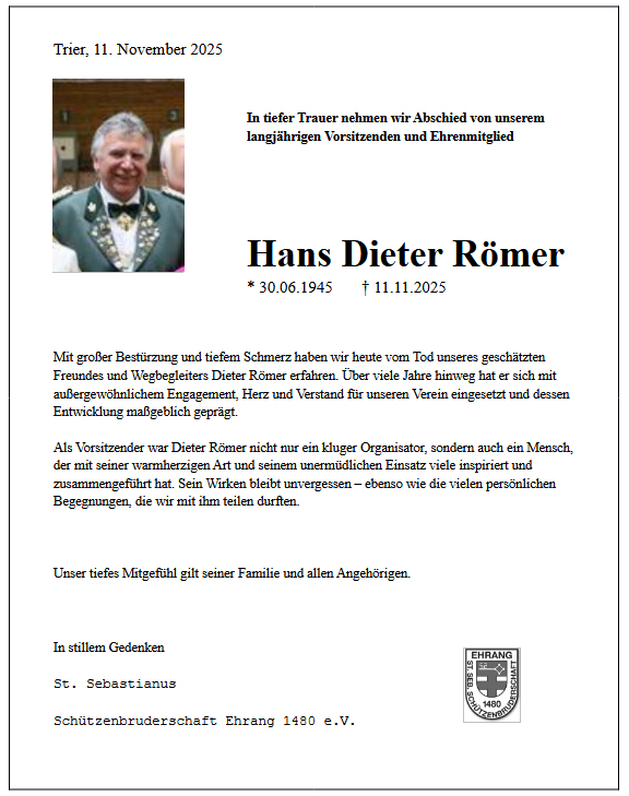 Mit großer Bestürzung und tiefem Schmerz haben wir heute vom Tod unseres geschätzten Freundes und Wegbegleiters Dieter Römer erfahren.